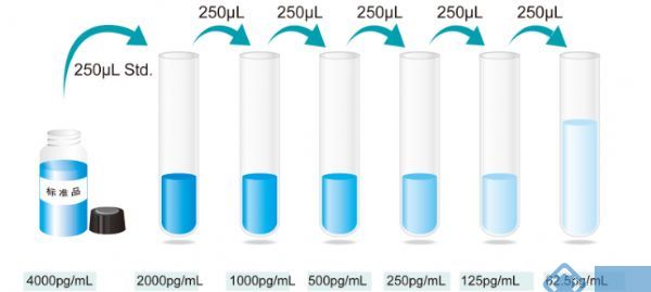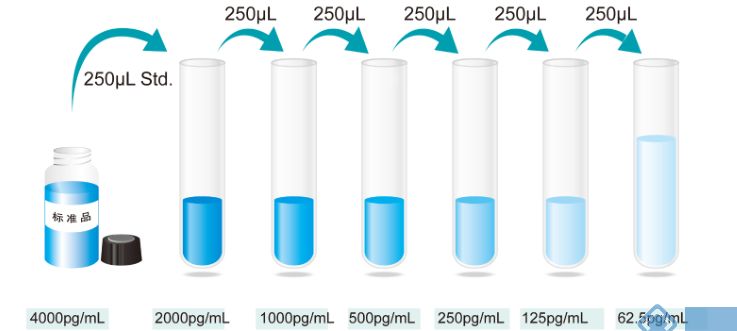 3.标准品梯度稀释:加入标准品/样本稀释液(SR1)0.5ml至冻干标准品中,静置15分钟待其完全溶解后轻轻混匀(浓度为4000pg/ml),然后按照以下浓度进行2倍稀释:4000、2000、1000、500、250、125、62.5pg/ml进行稀释,4000pg/ml为标准曲线最高点浓度,标准品/样本稀释液(SR1)作为标准曲线的零点(0pg/ml)。复溶过的标准品原液(4000pg/ml)未用完的应废弃或根据需要按照一次用量分装,并将其贮存在-20~-80℃冰箱,具体如下图。