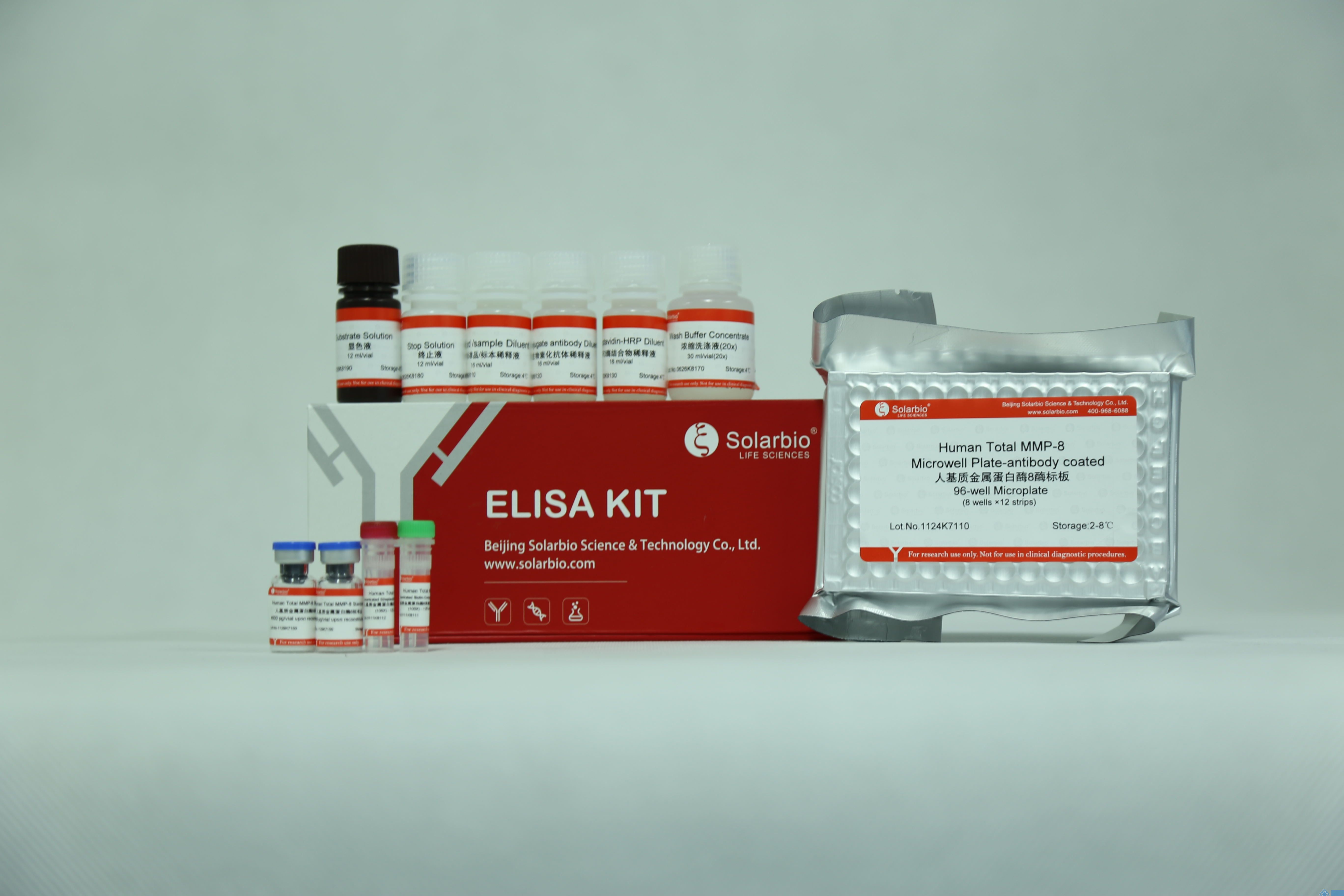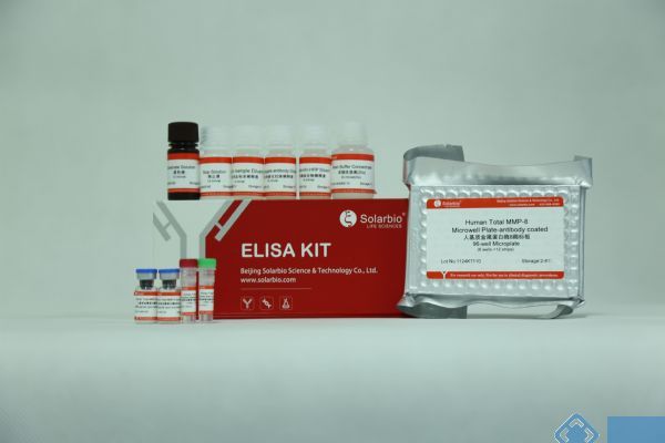 Solarbio (Solarbio ®) ELISA 试剂盒采用基于双抗体夹心法的酶联免疫吸附检测技术。将抗人 Total MMP-8 单克隆抗体包被在酶标板上;分别加入梯度稀释的标准品和预稀释的样本,标准品和样本中的人Total MMP-8 会与酶标板上的包被抗体充分结合;洗板后加入生物素化抗人 Total MMP-8 抗体,该抗体会与板子上包被抗体捕获的标准品和样本中的人 Total MMP-8 发生特异性结合;洗板后加入辣根过氧化物酶(HRP)标记的链霉亲和素,生物素与链霉亲和素会发生高强度的非共价结合;洗板后加入显色剂底物TMB,若反应孔中样品存在不同浓度的人 Total MMP-8,则 HRP 会使无色 TMB 变成不同深浅(正相关)的蓝色物质,加入终止液后反应孔会变成黄色;最后,在 λmax=450 nm(OD=450 nm)处测定反应孔样品吸光度(OD),样本中的人 Total MMP-8 浓度与 OD 成正比,通过绘制标准曲线和四参数拟合软件便可计算出样本中人 Total MMP-8 的浓度。